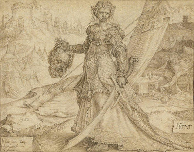 Martin van Heemskerck chose to show the Old Testament heroine Judith at her moment of triumph, holding up the decapitated head of Holofernes, an Assyrian general. The Assyrians had besieged Judith's city, but when the inhabitants were on the point of capitulating, she developed a plan to save them. Dressing herself so as to catch the eye of any man who might see her, Judith entered the enemy camp and quickly entranced the general with her beauty. He invited her to his tent with plans to seduce her, but became too drunk. She was therefore able to grab his sword and sever his head.