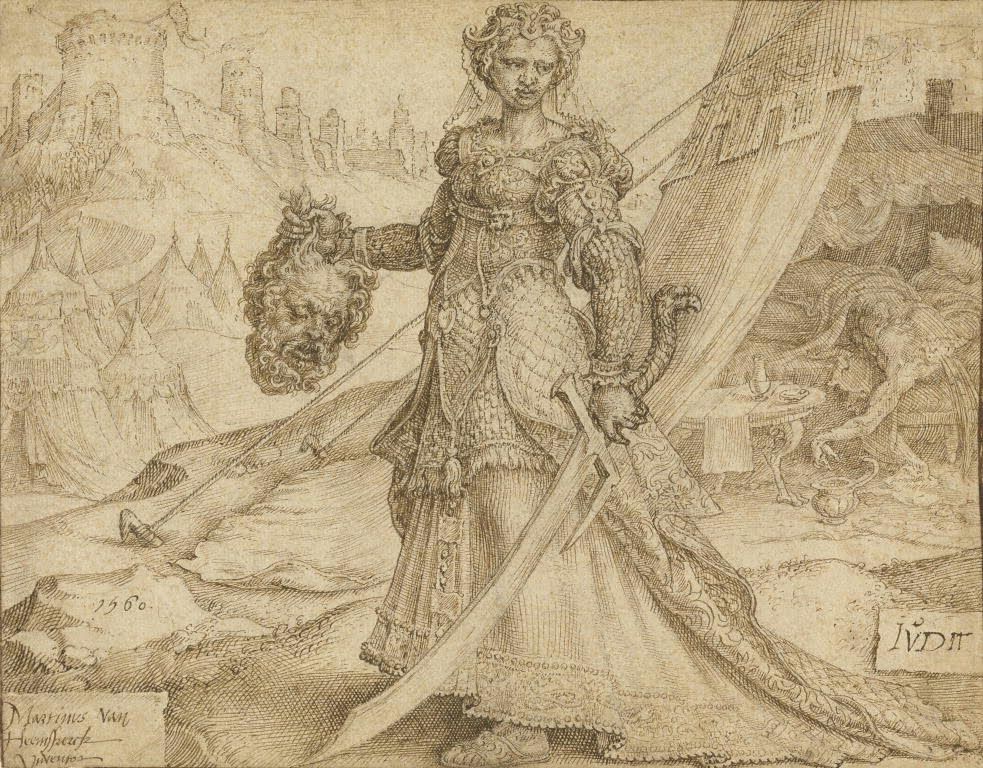 Van Heemskerck's careful cross-hatching and neat penwork indicate that this was a final version of this drawing. It was then passed to a printmaker to be copied for the engraving of Judith in the series of six prints illustrating Good Women of the Old Testament.